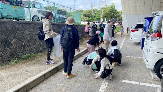 当日は「やまっち」のほか、沖縄市の児童館から「宮里児童センター」「あげだ児童館」「福祉文化プラザ児童センター」の子どもたちとキングスU18のユースチームも参加し、交流しながら山内自治会館周辺やコザ運動公園周辺、アリーナ周辺の美化活動を行いました。