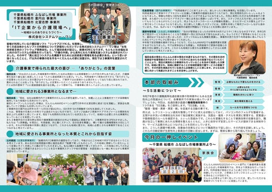 今号の特集では、千葉県船橋市で「だんらんの家」3事業所を運営する株式会社システムツー・ワンにフォーカス。もともとは介護記録ソフトの開発で長年、福祉を外側から支えてきたIT企業が、なぜ介護の現場へと踏み出したのか。そして、なぜ今、地域から深く信頼される事業所へと成長しているのか――。そこにあったのは、数字や仕組みだけでは語れない、「ありがとう」の力でした。