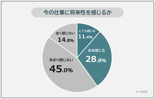 お仕事をしている500人に「今の仕事に将来性を感じているか」を聞いたところ、「とても感じる(11.4%)」「まあ感じる(28.8%)」と答えた人が合わせて40.2%で、半数に至りませんでした。つまり、ご自身の仕事の将来性について、不安を抱えている人のほうが多いのですね。
