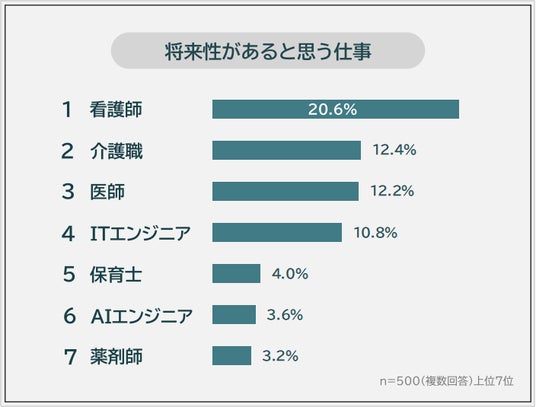 「将来性があると思う仕事」を聞いたところ、1位は「看護師(20.6%)」でした。2位は「介護職(12.4%)」、3位は「医師(12.2%)」となっています。