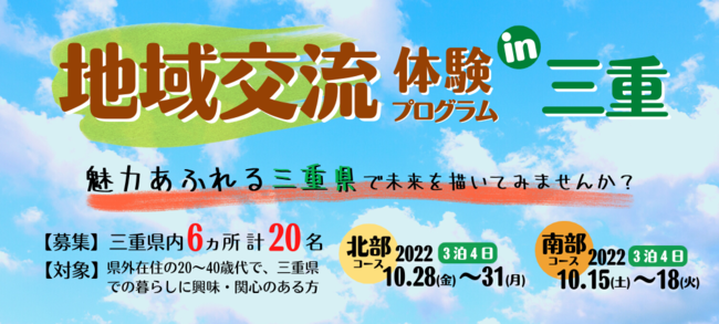 地方移住に関心のある三重県外の若者を募集し、地域づくり等の現場体験やそこに住む住民との交流などを通じて、地域とつながり、活躍の場を見つけてもらう『地域交流体験プログラムin三重』を実施し、参加者を募集します。