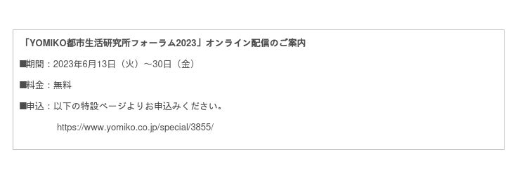 株式会社読売広告社(本社:東京都港区/代表取締役社長:菊地英之)は、2023年6月6日(火)に赤坂インターシティコンファレンス「the AIR」にて、「YOMIKO都市生活研究所フォーラム2023」を開催し、当社の都市生活研究所が行なっている様々な研究・調査に関する最新の結果を発表しました。