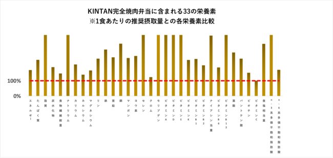 博報堂生活総合研究所「生活定点」調査によると、焼肉は73%の人が「好きな料理」として回答をするほど絶大な人気を誇る反面、高カロリー・高脂質など体に悪そうな印象も捨てきれません。しかし牛肉には生きていく上では欠かせない必須アミノ酸が摂取できる良質なたんぱく質や鉄が豊富に含まれております。この牛肉の持つ栄養素を生かし、「日本人の食事摂取基準」で設定された33種類の栄養素の1/3量が1食で摂取できるお弁当を開発いたしました。