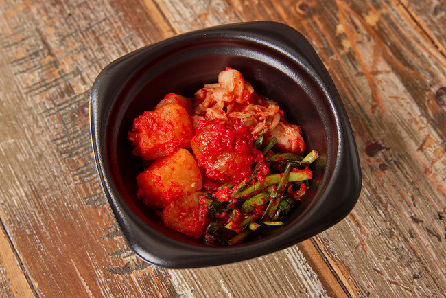 梅干しキムチ・ニラキムチ・白菜キムチ・カクテキの4種を副菜としてご用意いたしました。特にニラキムチにはビタミンEが多く含まれ、強い抗酸化作用を持ち、体内の脂質の酸化を防ぎます。動脈硬化や血栓の予防、血圧の低下、LDL(悪玉)コレステロールの減少、細胞膜を健全に保つなどの働きがあり、“若返りのビタミン”とも呼ばれます。