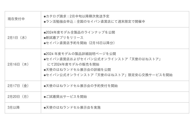 2月16日(木)の販売開始に伴い、本日、2024年度ご入学者さま向け販売スケジュールをセイバン公式「天使のはね」ブランドサイトで公開いたしました。 2月1日(水) には、2024年度モデル全製品のラインナップ公開、 全国のセイバン直営店の予約開始、新試着アプリのリリースを予定しております。