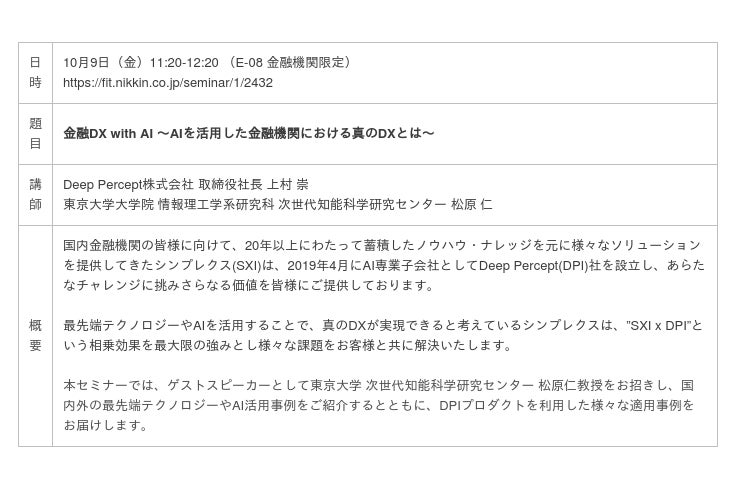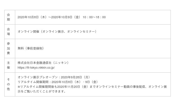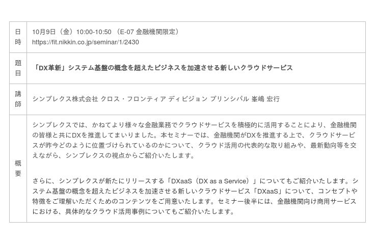 シンプレクス株式会社は、2020年10月8日(木)~9日(金)にかけてオンライン開催される株式会社日本金融通信社(ニッキン)主催の「FIT2020 online(金融国際情報技術展)」に、ゴールドスポンサーとして出展します。