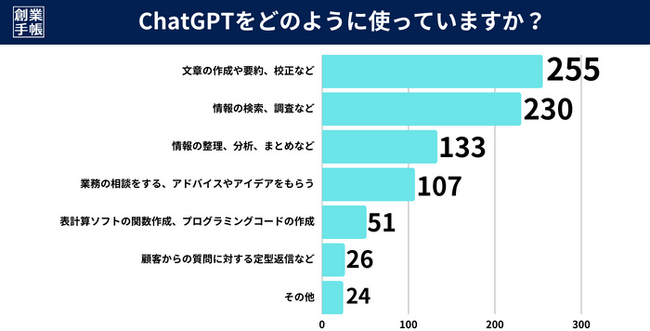 起業家・経営者を支援する創業手帳では、会員の起業家に対しOpenAIの提供するChatGPT(各バージョンを含む。以下ChatGPTと表記)の使用と活用の独自アンケートを実施し562件の回答(方法:WEBフォーム。実名回答)を得ました。