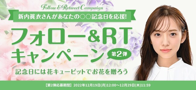 第二弾では、12月19日~12月29日の期間中に花キューピット公式Twitterアカウントをフォロー、リツイートするとフラワーギフトを10名様にプレゼントします。また、Wチャンスとして、動画の感想をTwitterのキャンペーン投稿にリプライしていただいた方から、5名様に「新内さんサイン入り応援ポストカード」をプレゼントいたします。