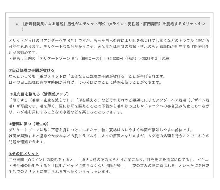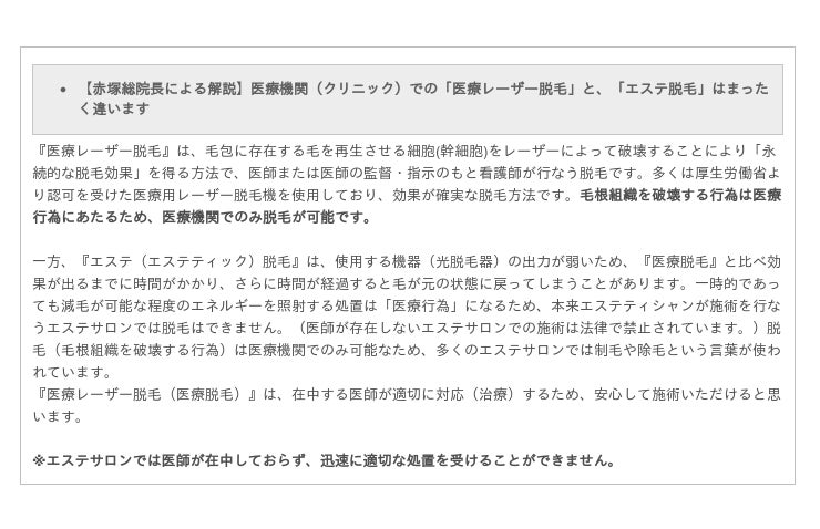 また「エステとクリニックの脱毛って、一体どう違うの?」「脱毛で、形を整えることができるの?」「アンダーヘア脱毛のメリットは?」等、よくある「毛の疑問や必要性」に関し、当院総院長の赤塚正洋医師が一部解説をいたします。