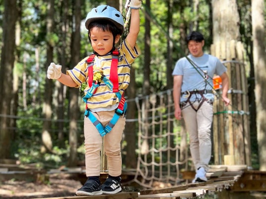 公園内には、全国40箇所で事業展開する自然共生型アウトドアパーク「フォレストアドベンチャー」があり、4月には身長90cmの小さなお子さまが挑戦できるキッズコースがオープンします。山の地形を利用したジップスライドなど、7コース25アクティビティが楽しめ、キッズコースとしてはアクティビティ数全国No.1の規模を誇ります。コース上から地面に滑り下りるまで外れることのないハーネス(安全器具)を装着し、保護者の方の目の届く範囲で安心して楽しむことができます。