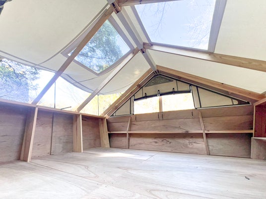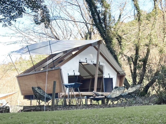 全国20箇所のキャンプ場を運営し、利用者ニーズを熟知する株式会社Recampと、デジタル技術を駆使して、革新的な取組を行う設計集団VUILDが共同開発した「TENT★CABIN」は、テントの「自由」と 建物の「安心」の ちょうど間にあるような心地よさを追求。やさしい印象のしっかりとした木の構造と、大きく開く可動式の屋根からは空間のひろがりや自然とのつながりを強く感じることができます。