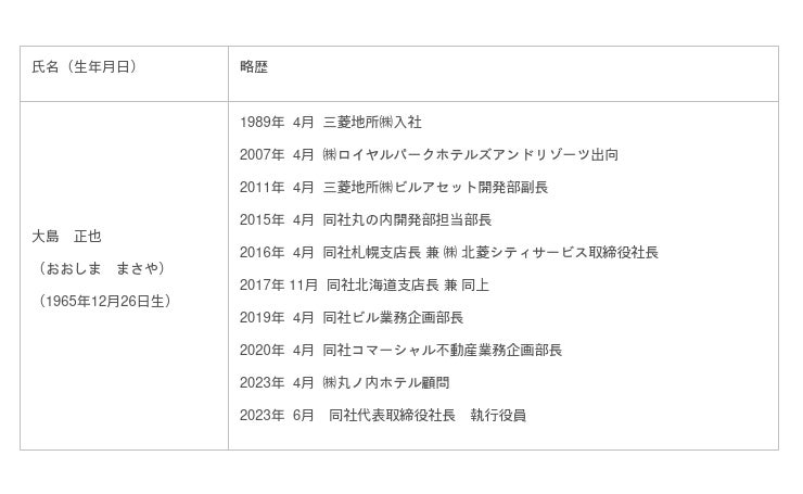 株式会社丸ノ内ホテル(所在地:東京都千代田区丸の内1-6-3)は、2023年6月27日付で、以下の通り、社長交代を行うことを決定いたしましたのでお知らせいたします。