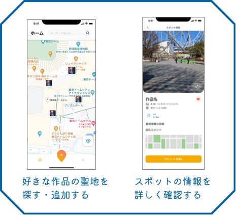 聖地ソーシャルマップ ユーザーが訪れた“聖地”を位置情報・写真・感想とともにマップ上に投稿。作品名での検索も可能で、自分だけの巡礼記録を地図として残せるほか、他ユーザーの投稿から新たな聖地を発見することも可能です。