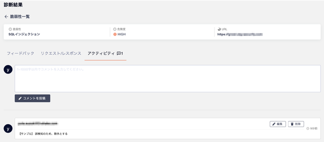 新機能として追加した「アクティビティのコメント機能」は、診断結果の脆弱性に対して、対応内容や除外理由などをコメントとして記録できる機能です。これにより発見された脆弱性の管理が容易になり、また実務作業を行うエンジニアに限らず、管理者や関係者が対応状況を確認できるようになりました。