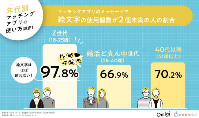 次に、「絵文字の使用数」を調査したところ、Z世代の97.8%が絵文字の数を2個未満と回答。婚活ど真ん中世代の66.9%、40代以降の70.2%と比較しても、Z世代は圧倒的に絵文字を使わないことがわかります。