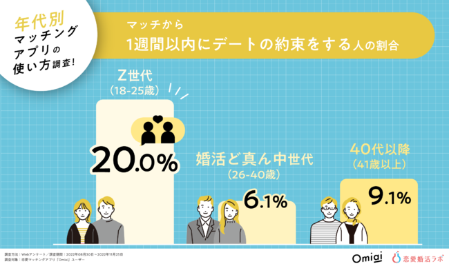 「マッチングアプリ内で出会った異性とデートに行く約束をするまでの日数」は、Z世代は「1週間未満」が20.0%で第1位でした。これは、婚活ど真ん中世代、40代以降と比べて約2倍以上多い結果となりました。