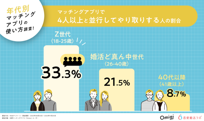 1.【マッチングアプリの使い方調査】Z世代は“タイパ意識 ”!33%が「4人以上のお相手」と同時に連絡をとっている!