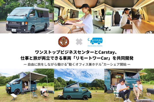 全国でバーチャルオフィスを展開し起業支援を行う株式会社ワンストップビジネスセンター(取締役社長:生田 泰啓、本社:東京都港区)と、キャンピングカーと車中泊スポットのシェアリングサービス、車両製造・リノベーションなど国内最大級のバンライフのプラットフォーム事業を展開するCarstay株式会社(代表取締役:宮下晃樹、本社:神奈川県横浜市)は、起業家・フリーランサー向けの“動くオフィス”と“動くホテル”を兼ね備えた車両「リモートワーCar(リモートワーカー)」を共同開発し、本日からカーシェアリング・サービスを開始しました。ワンストップビジネスセンター会員向けにカーシェアリングを先行開始し、年内までにCarstay会員向けにもサービス開始を目指します。