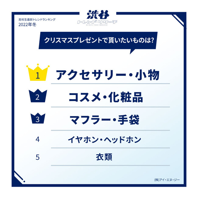 渋谷トレンドリサーチは、回収したデータに基づき、渋谷を拠点に運営するINGteens高校生メンバーの生の声を反映し、どこよりもリアルで鮮度の高い最新の高校生トレンドを発表します。