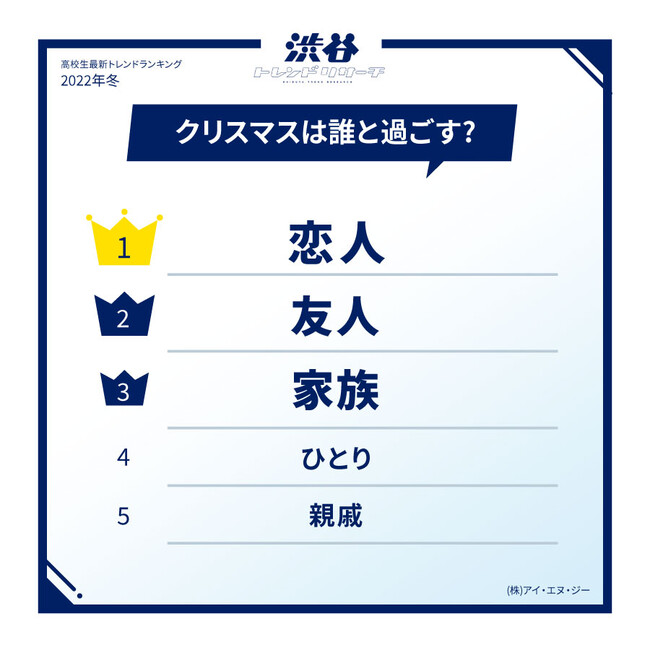 「恋人」が1位を獲得する結果となりました。コメントには「イルミネーションを一緒に見たい」(高1・女子)「恋人とお泊りデートをしたい」(高3・男子)などがあり、クリスマスは"恋人の日"というイメージがやはり根強いようです。一方で、友人と過ごすという意見も多く見られました。バルーンなどの装飾を持ち込み、インスタ映えを狙える"ホカンス"等の登場により、日本ではあまり馴染みのないホームパーティー文化がZ世代に浸透しているようです。そういった背景から「友人を家に招いて一緒にパーティーをしたい」(高3・女子)といったコメントが多数寄せられました。
