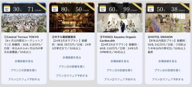 結婚式を挙げたいカップルと、式場が持つサービスを最大限繋ぐことができるトキハナだからこそできるこの取り組み。インターネットで調べるだけでは巡り会えなかったこの情報を多くの方に知ってもらうことで、ウェディングを通して特別な体験をしていただけたり、費用面で結婚式を諦めていた方たちに、新しい提案の機会を創ることを目指して参ります。