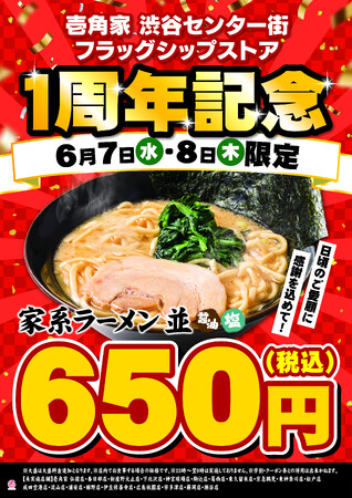 株式会社ガーデン(本社:東京都新宿区 代表取締役社長:川島賢 以下「当社」)が運営する「壱角家」は、渋谷ガーデンビルオープン1周年を記念し、2023年6月7日(水)と6月8日(木)の2日間限定で、通常「家系ラーメン」を税込820円のところ、税込650円にて提供するキャンペーンを実施いたします。ぜひこの機会に壱角家の家系ラーメンをお楽しみください。
