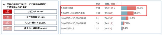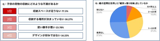他にも、第3位がクローゼット(27.57%)、第4位が押入れ・収納庫(26.49%)と、住まいに備わった収納においても子供の荷物に悩みを感じている人が多い結果に。