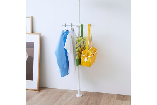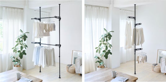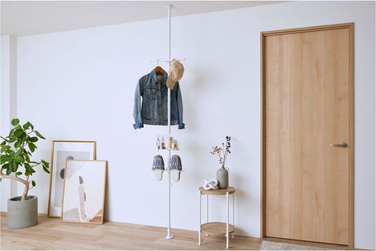 シンプルデザインでお部屋に馴染む、スリムで場所をとらない突っ張り物干しも同日発売
