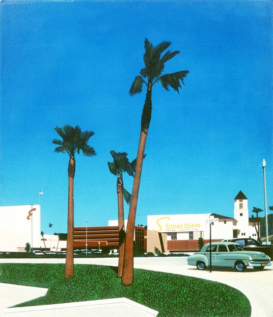 永井博のビジュアルを通して、青い水平線やプールサイド、ヤシの木など