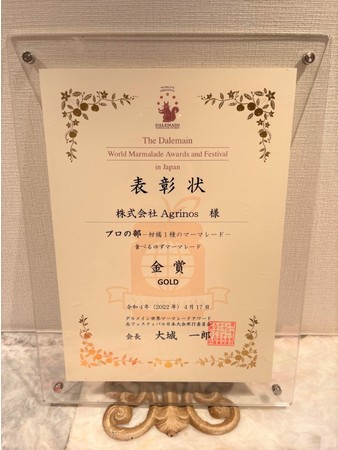 株式会社Arinos(所在地:東京都港区、代表取締役:古家由也)の関連会社で、静岡県川根本町でゆずの栽培や各地で農業関連ビジネスに関するコンサルティングなどを行う、株式会社Agrinos(所在地:静岡県榛原郡、代表取締役:高橋七海、以下Agrinos)が販売する「そのまま食べるゆずマーマレード」が、2022年2月1日(火)~3月14日(月)にかけて開催されました、第4回ダルメイン世界マーマレードアワード&フェスティバル日本大会において、金賞を受賞いたしましたのでお知らせします。