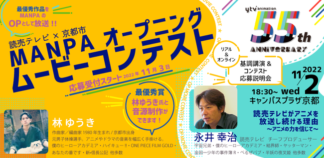 本プロジェクトの一環として、京都市と讀賣テレビ放送株式会社(本社:大阪市中央区 以下、読売テレビ)が共催し「読売テレビアニメ放送55周年記念 MANPAオープニングムービーコンテスト」を開催します。