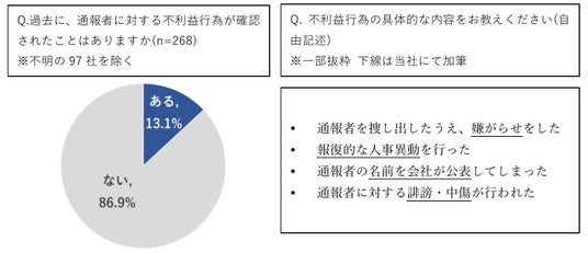 2. 13.1%の企業で、通報者に対する不利益行為(嫌がらせや報復人事など)が確認されたことがある