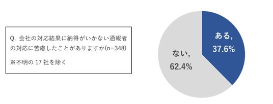今回の調査においては37.6%の企業で、会社の対応結果に納得がいかない通報者の対応に苦慮したことがあるという回答が確認されました。