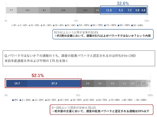 「パワハラではないか?として通報が入るのは全体の何%か」という設問に51%以上であるとの回答を選択した企業は全体の約3割(32.6%)でした。その中で、「パワハラではないか?という通報のうち、調査の結果パワハラと認定されるのは何%か」との設問に10%以下であるとの回答を選択した企業は約半数(52.1%)に上りました。