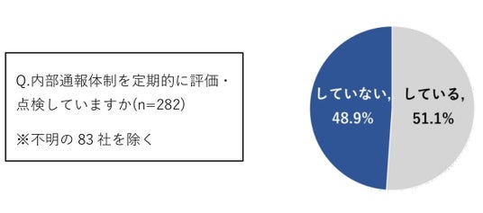 公益通報者保護法では、「内部公益通報対応体制の定期的な評価・点検を実施し、必要に応じて内部公益通報対応体制の改善を行う」ことが義務付けられています。しかし、今回の調査においては、48.9%の企業において内部通報体制を定期的に評価・点検していないことが分かりました。