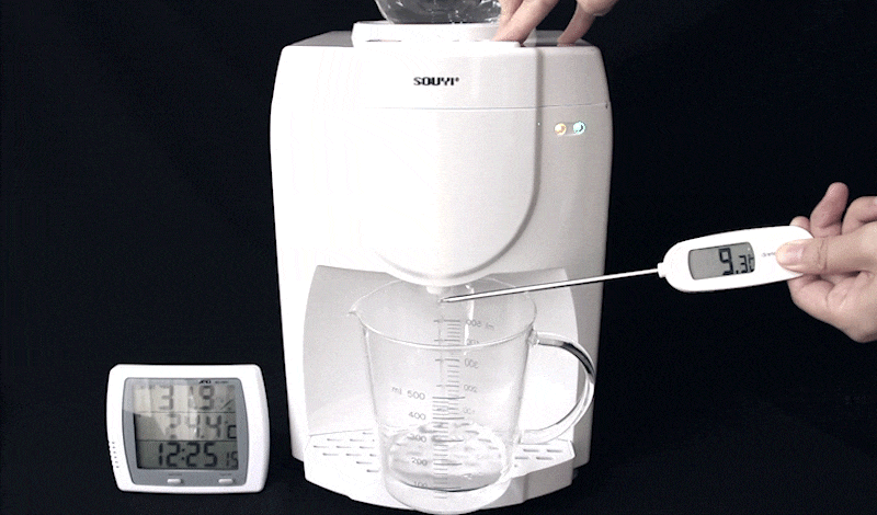 他社製品と比較して、弊社のウォーターサーバー冷水温度は9℃と低く、また水受けトレーがスライド式で幅の調整ができるので、容器の大きさに関係なく容器を手で支えなくても給水ができます。