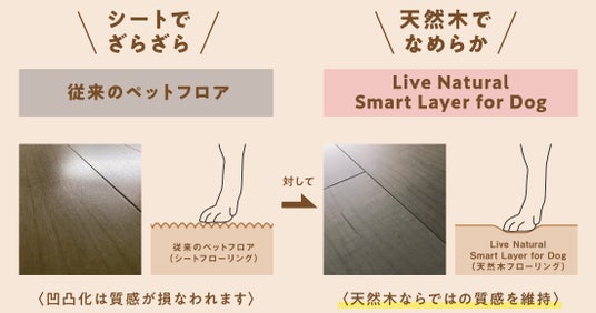 そこで当社は、業界で初めて床暖房フローリングを開発した技術と、ペット対応天然木フローリング「LiveNatural for Dog」で 培った独自ノウハウを統合。“上貼りでも、天然木突き板 × 既存床暖房対応 ×ペット対応 をあきらめない”という新たな価値を 実現した「LiveNaturalスマートレイヤー 」を開発しました。