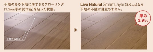 LiveNaturalスマートレイヤー for Dogは、3.9mmの適度な厚みと強度を確保することで、下地の影響を受けにくく、美しい仕上がりを維持します。天然木の表情を引き立てるために必要な“施工後の美観”にも配慮した設計です。