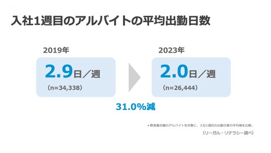 日本のサービス業では、2030年には約60万人の人材不足が予想されています。リーガル・リテラシーの調査結果からは、特に人手が求められる飲食業界において、入社1か月以内に12%のアルバイト・パート社員が退職し、初日に退職する人は1週間以内の退職者の半数をも占めることがわかっています(図1)。また、アルバイトの出勤頻度も減少傾向にあり、働き方にも変化が見られています(図2)。