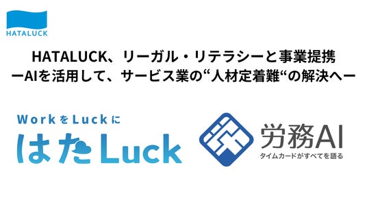 サービス業の生産性と働きがい向上を支援する株式会社HataLuck and Person(本社:東京都中央区、代表:染谷 剛史、以下「HATALUCK」)は、飲食店の労務改善を推進する株式会社リーガル・リテラシー(本社:東京都渋谷区、代表:黒部 得善)と事業提携を行いました。本提携により、両社が持つAIによるデータ分析技術とプロダクトを連携し、サービス業における人材の採用面談から定着・戦力化までのプロセスをトータルサポートすることを目指します。