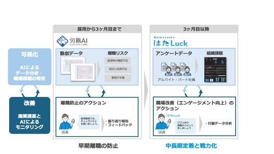 ・職場DXアプリ「はたLuck」:アルバイト・パート社員に職場に関するアンケートを実施。アンケート結果から、エンゲージメントや行動・コミュニケーションデータをAIで分析する。職場の組織課題を明確にし、職場ごとに改善施策を提案することで、3か月以降の中長期的な人材定着と戦力化を促進する。