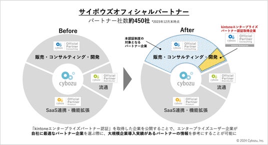 エンタープライズユーザー企業が、より一層最適なパートナー企業選択がしやすくなるように設立いたしました。 サイボウズは、対象となるパートナー企業の、エンタープライズ企業への導入実績やサポート体制、ノウハウ、技術力などを総合的に審査します。認証企業の募集は、同年 4 月 19 日(金)より開始し常時受付けています。