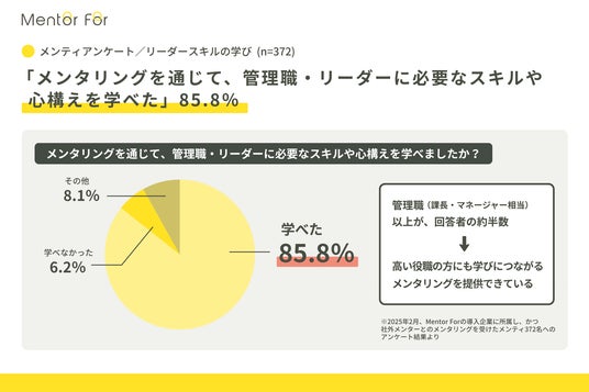 Mentor Forのメンタリングを通じて、「管理職・リーダーに必要なスキルや心構えを学べた」と答えたメンティは85.8%にのぼりました。今回のアンケートの回答者は「管理職の立場についている方が約半数」「部長相当以上の上級管理職も約1割」であるなか、高い役職の方にも学びにつながるメンタリングが提供できていると考えています。