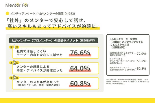 「社外」のメンターであることで安心して話せることに加え、メンターの高いスキルやメンタリングが複数回であったことで、アドバイスが的確になっているものと考えられます。