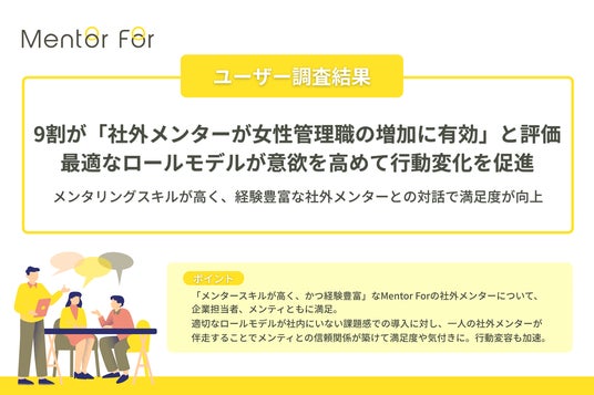 企業のDE&I(Diversity, Equity & Inclusion)・女性活躍推進を目的とした、社外メンターの育成・マッチング・社内メンター制度支援を提供する株式会社Mentor For(東京都品川区、代表取締役CEO・池原真佐子、以下Mentor For)は、Mentor Forの社外メンターサービス導入企業に向けて、社外メンターの効果に関するアンケートを実施しました。