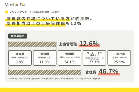 今回アンケートに答えてくださったメンティは、管理職の立場についている方が46.7%と約半数にのぼりました。部長相当以上の上級管理職も12.6%です。