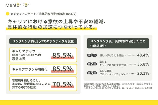 メンタリング後は、「新しい学びなどを開始」「上司とキャリアについての対話」など、具体的な行動の加速につながっています。