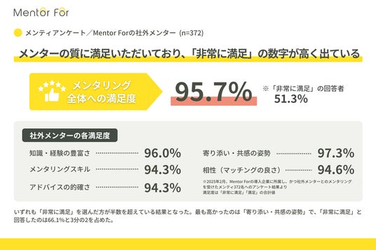 - 「メンタースキルが高く、かつ経験豊富」なMentor Forの社外メンターについて、企業担当者、メンティともに満足。