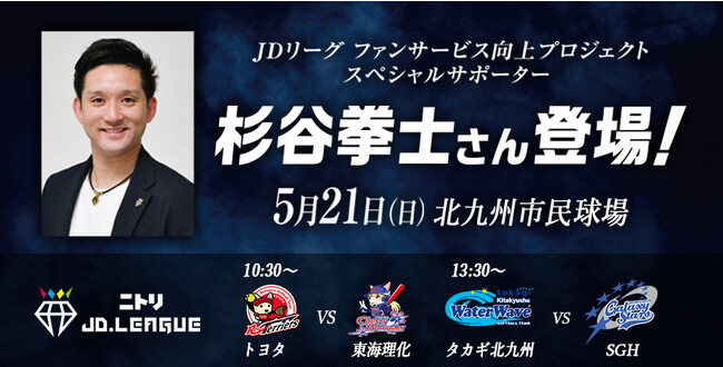 一般社団法人 日本女子ソフトボールリーグ機構(所在地:東京都新宿区霞ヶ丘町4-2 10階、代表理事:三宅 豊、島田 利正)は、5月21日(日)に北九州市民球場で開催するニトリJD.LEAGUE 2023レギュラーシーズン第5節に、プロ野球・北海道日本ハムファイターズOBで、今年4月にJD.LEAGUEファンサービス向上プロジェクトスペシャルサポーターに就任した杉谷拳士さんが来場いたしますことを下記のとおりお知らせいたします。