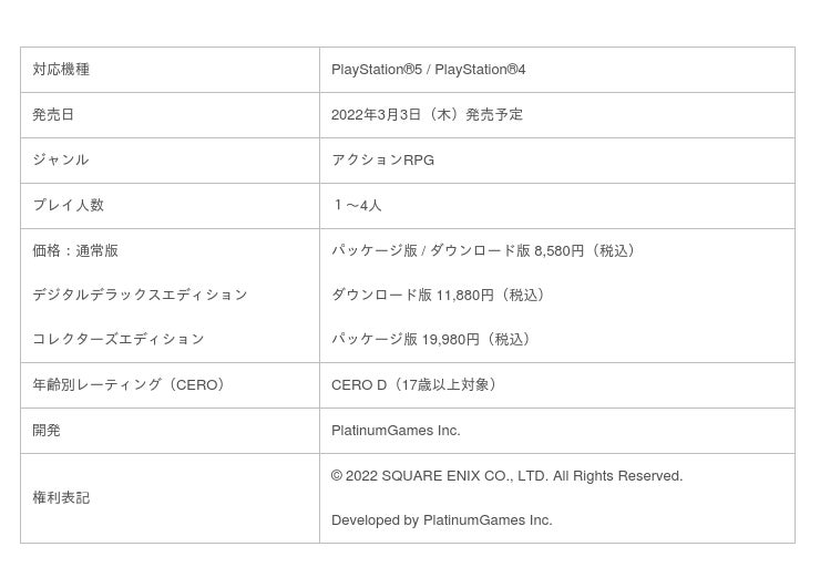 スクウェア・エニックス プロデュース プラチナゲームズ 開発のアクションRPG